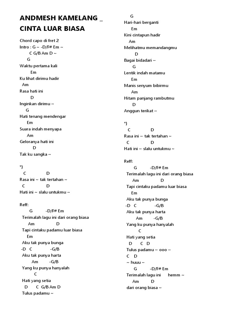 Berikut ini chord gitar dan lirik lagu cinta luar biasa dari andmesh kamaleng yang cukup fenomenal sejak dirilis. Cinta Luar Biasa Chords by Andmesh. 6127 views added to favorites 354 times.